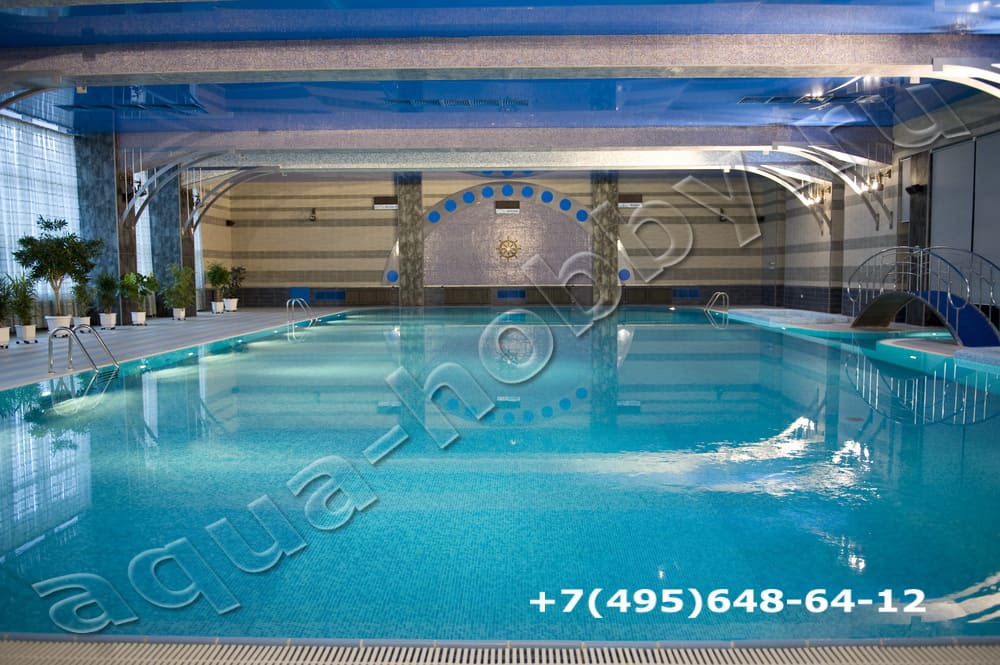 Бассейн 25м х 12м; зона ЛФК 5м х 3м; 2 джакузи 3м х 1,5м; Купели в 2-х саунах 2,5м х 2,5м. Cжатые сроки для производства работ, ограниченнность зоны погрузки-выгрузки (мусор, материалы, оборудование), строгая пропускная система доступа на объект, суточные ограничения по времени производства шумных работ, работы на высоте свыше 6 метров.