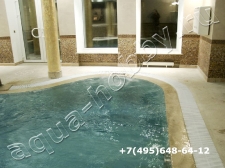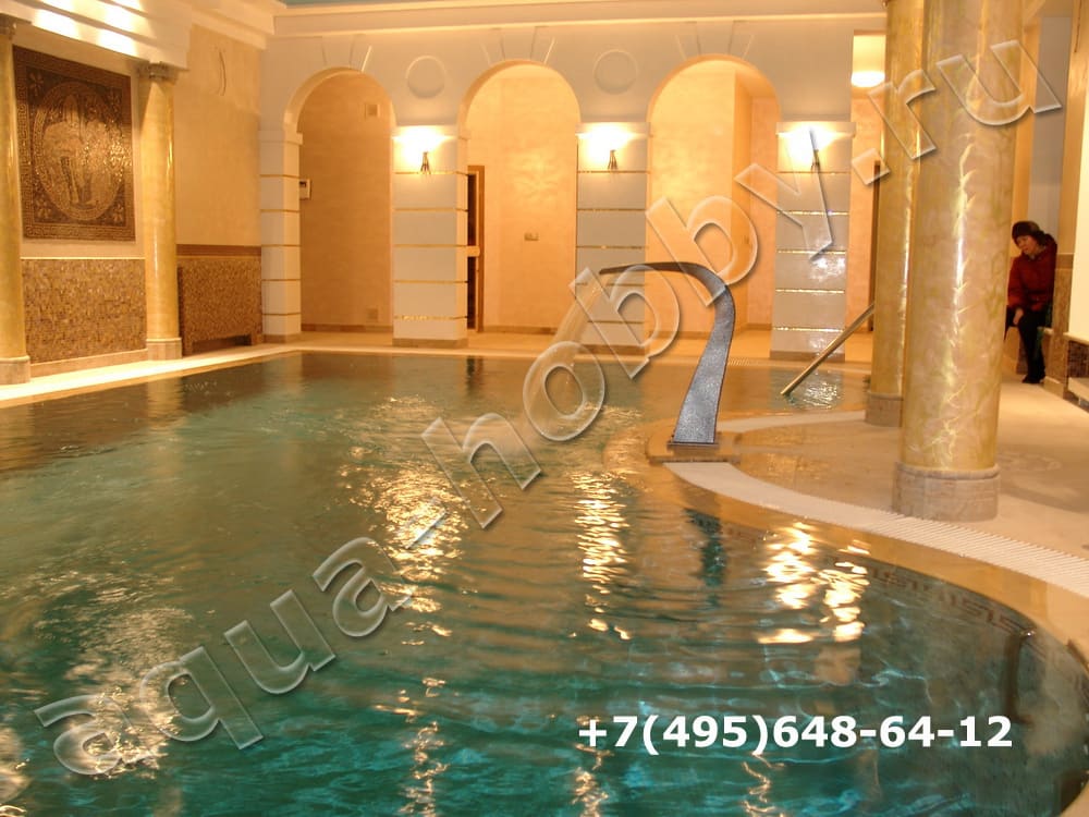 Проектирование чаши бассейна, бетонирование чаши бассейна и опорной плиты, оштукатуривание чаши бассейна, устройство гидроизоляционного слоя, облицовка бассейна мозаикой, монтаж и пуско-наладка оборудования и аттракционов бассейна, устройство финской сауны (печь с парогенератором). Дизайнерская отделка помещения бассейна.