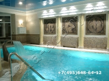 Бассейн - мозаика с авантюрином, помещение - фальшколонны с отделкой веницианской штукатуркой, натяжной потолок, мозаичные панно, мозаика и керамогранит, покраска.
